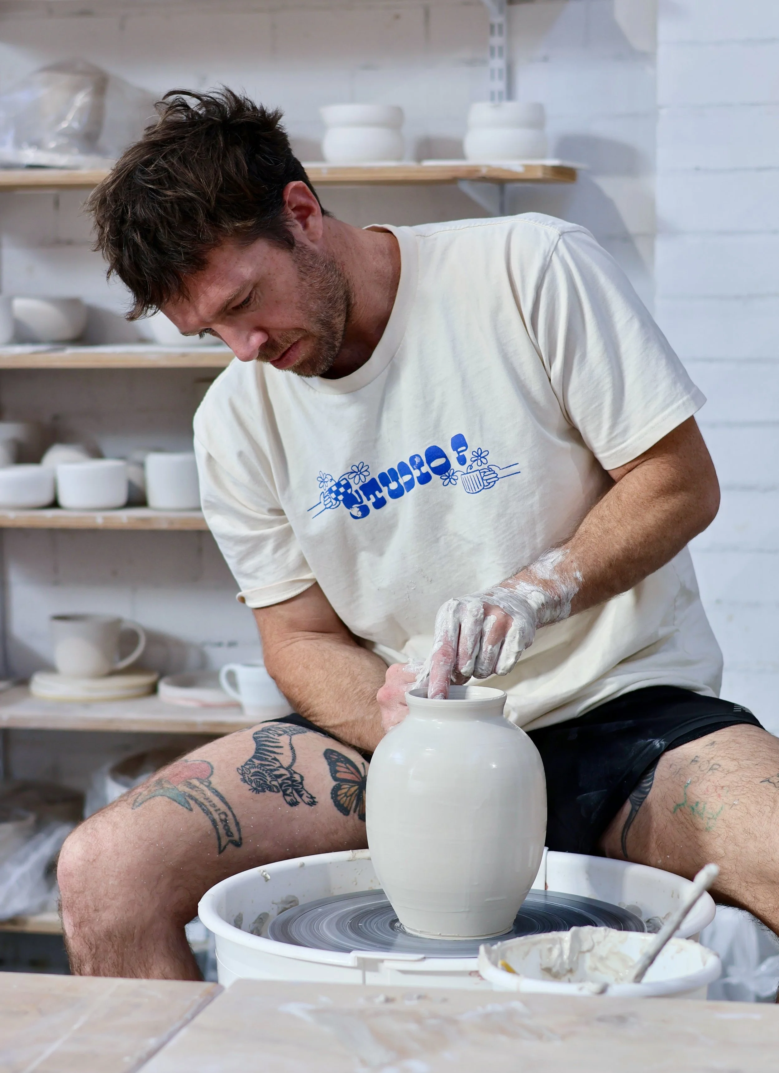 Expressive, juvenescent and bespoke, Vaughan Smithson’s ceramics are handthrown, hand-painted, and one-of-a-kind, capturing technical skill, attitude and experimentation with a lyrical twist of fate.Vaughan began his journey with pottery in 2015, drawn to the tactile nature of clay and the transformative power of the kiln. Over the years, he has developed a practice rooted in experimentation, exploring various clay bodies, forms, and glazes. While his work is predominantly wheel-thrown, Vaughan's focus extends beyond functionality to artistic expression, often creating larger vessels that blend tradition with contemporary design. Many of his porcelain vessels explore language as surface memory — cobalt inscriptions held within restrained, architectural forms.