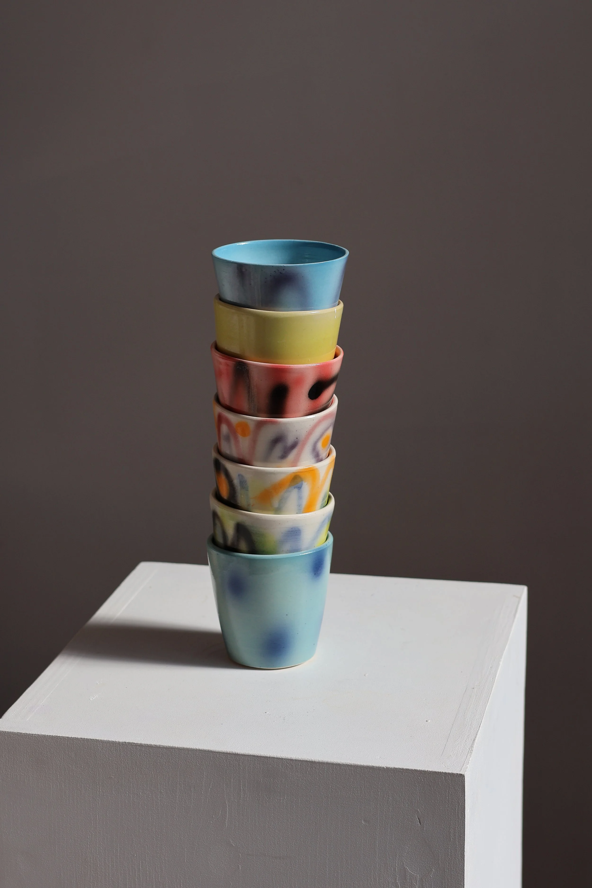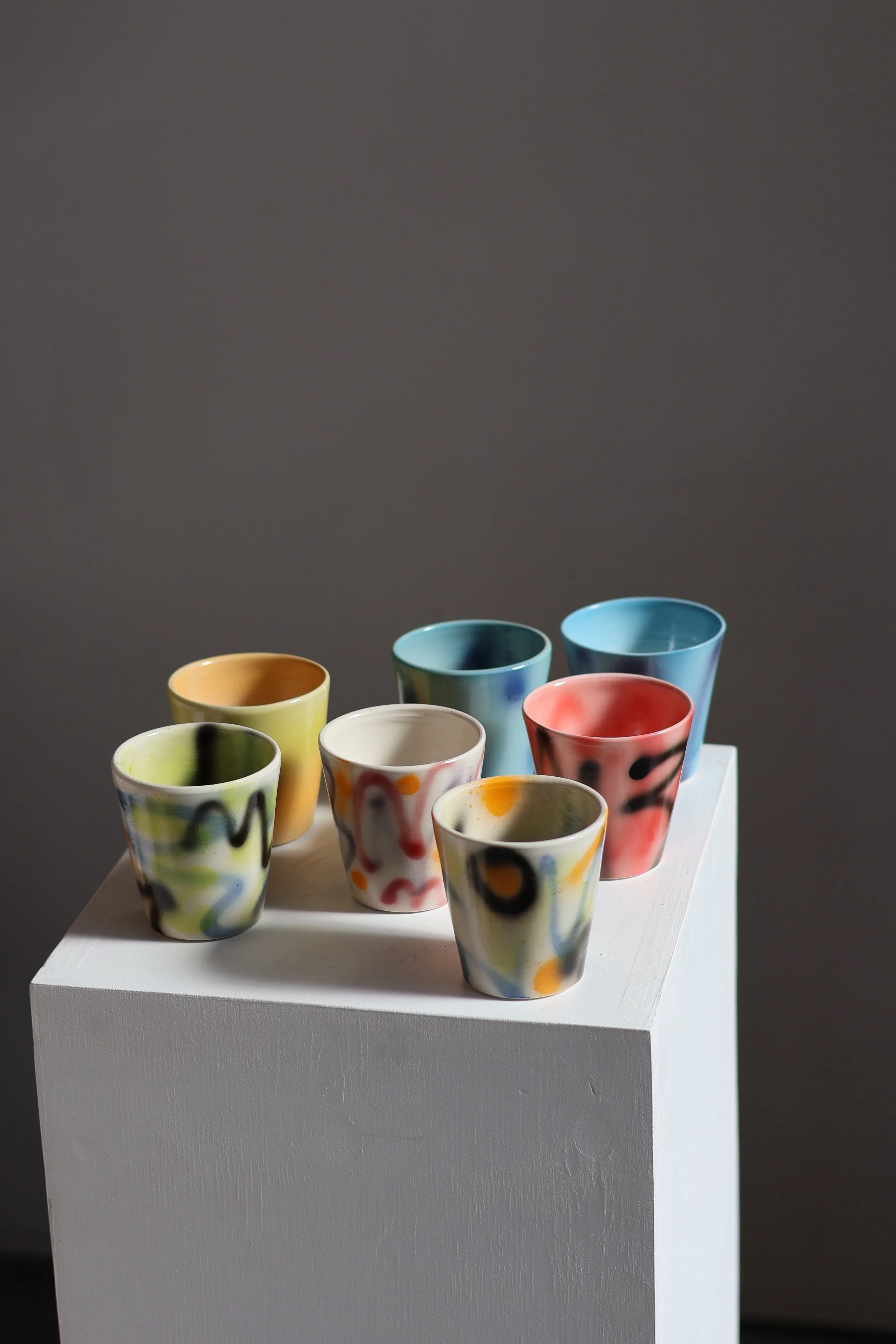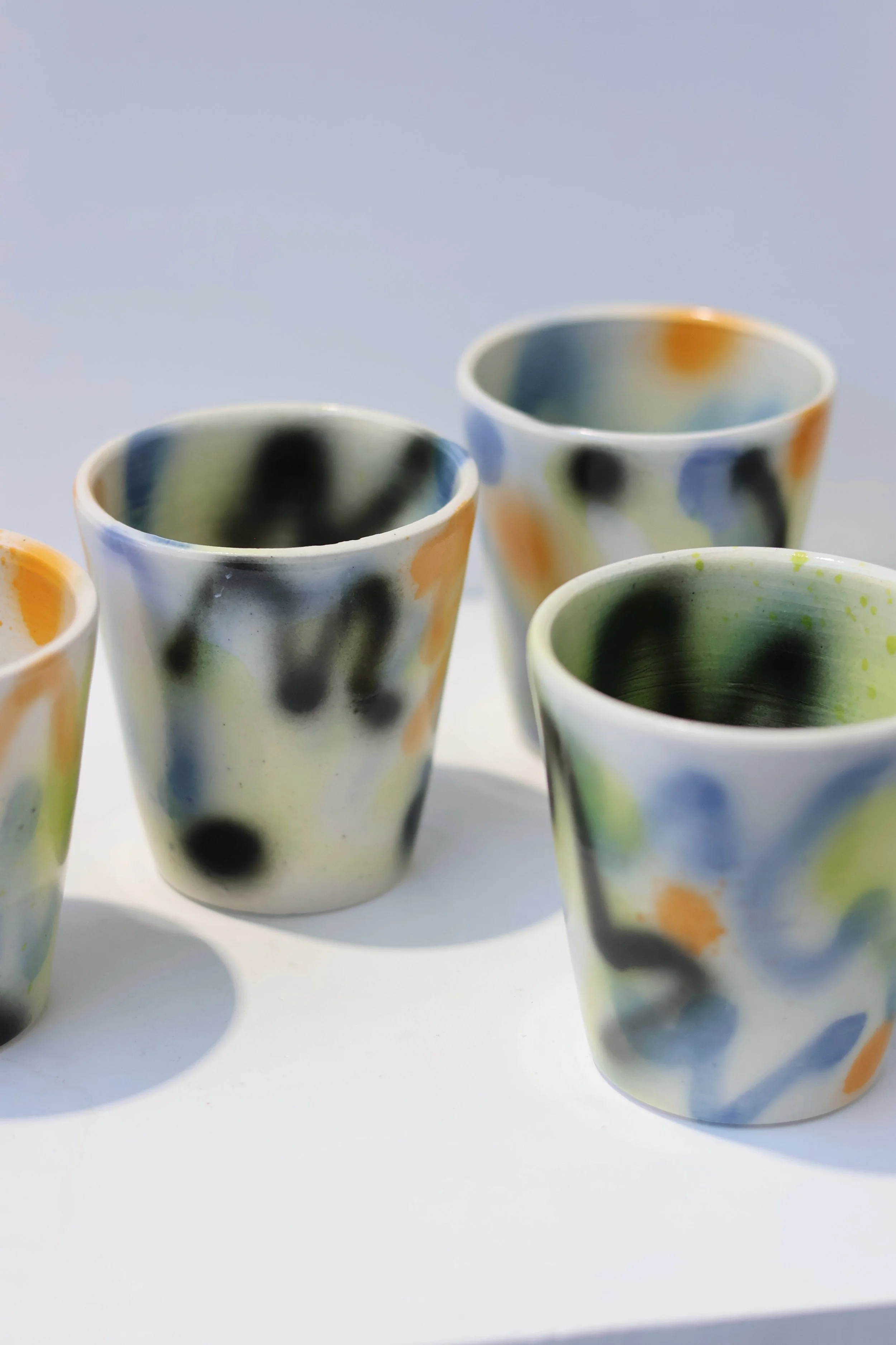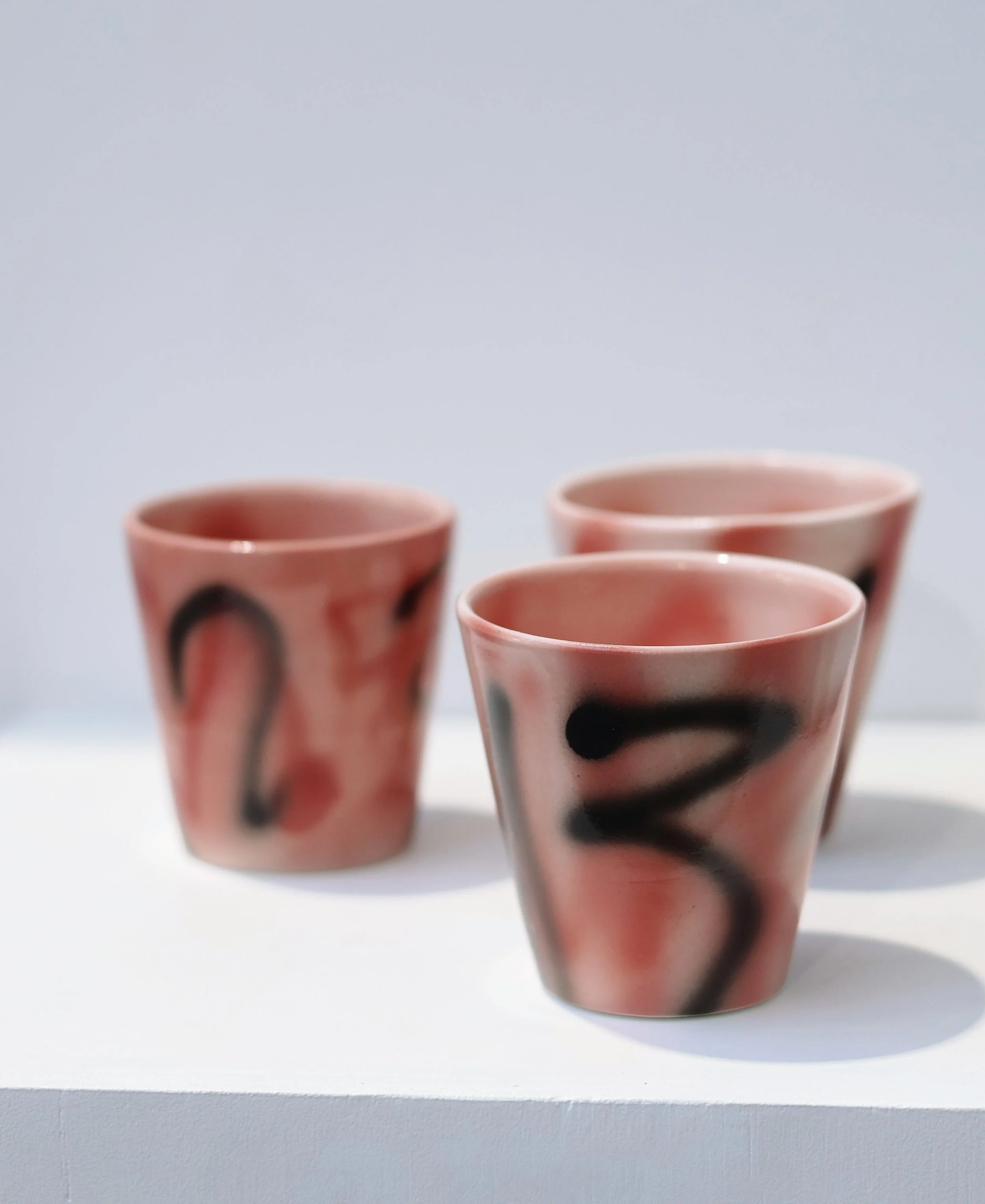 Wheel-thrown porcelain/stoneware cups with hand-decorated surfaces — graffiti-like in gesture, restrained in form.