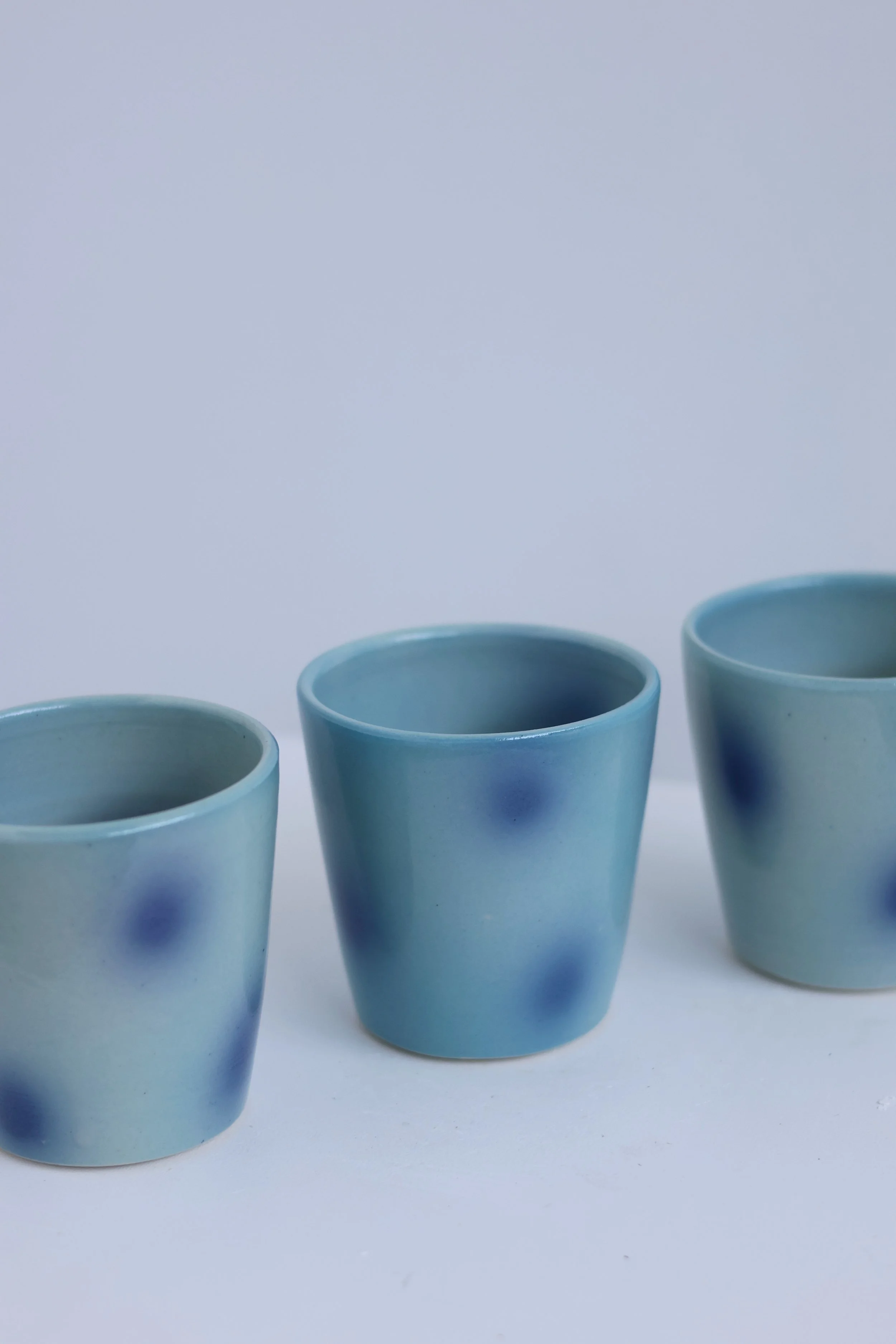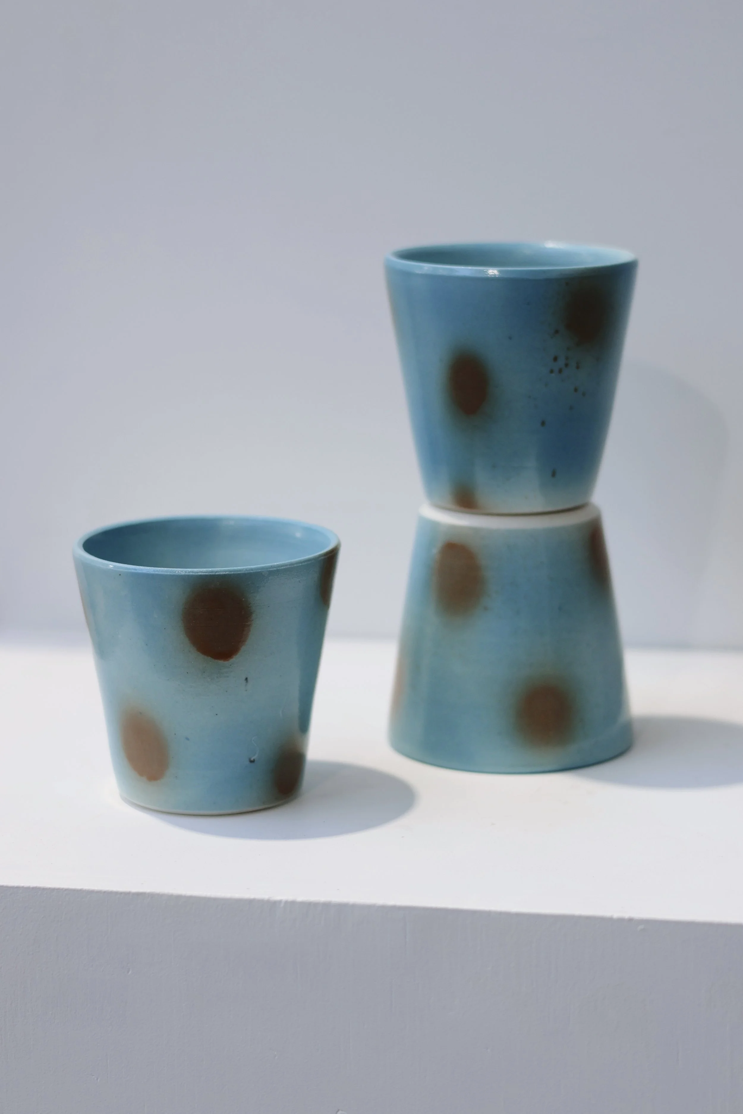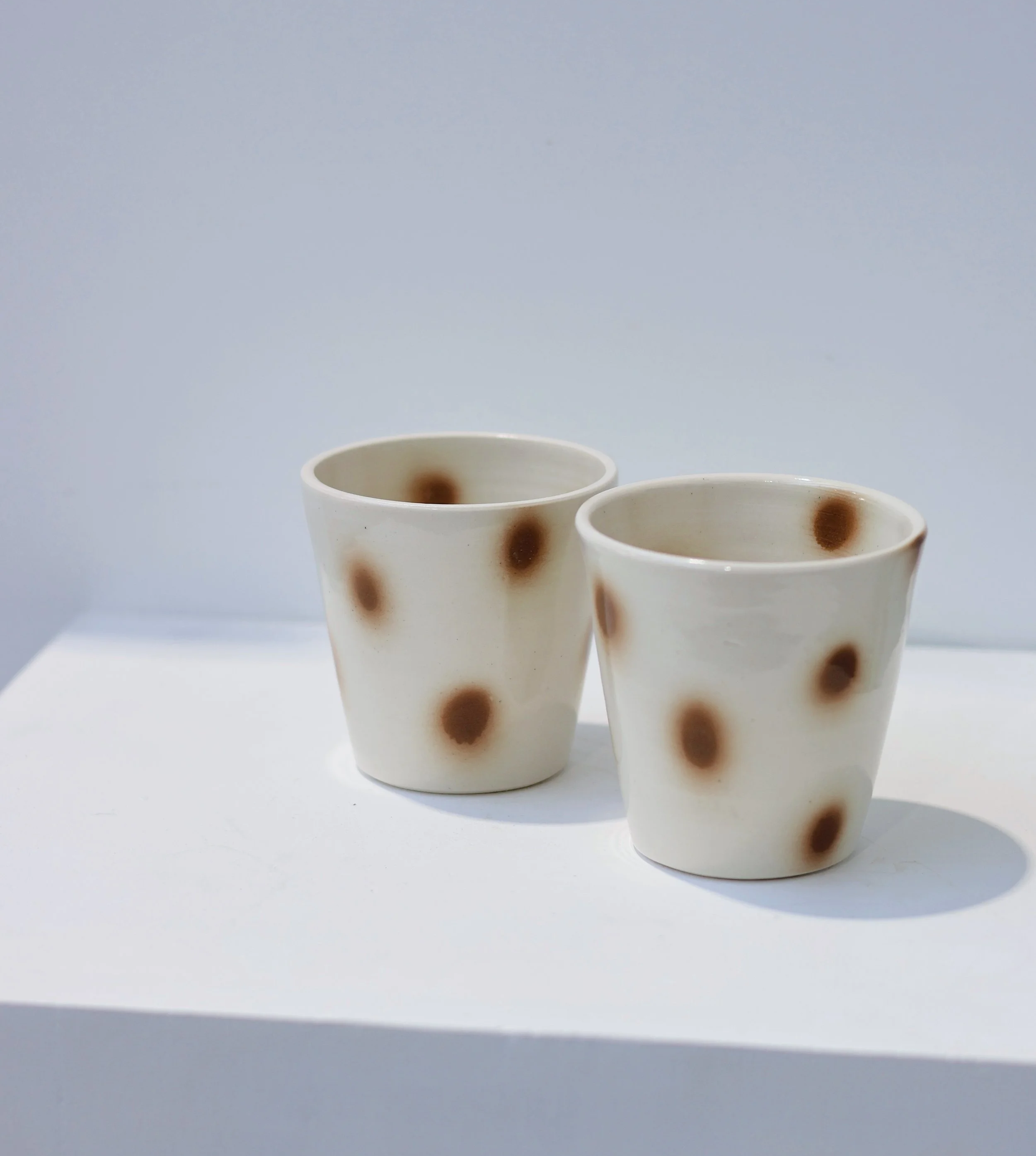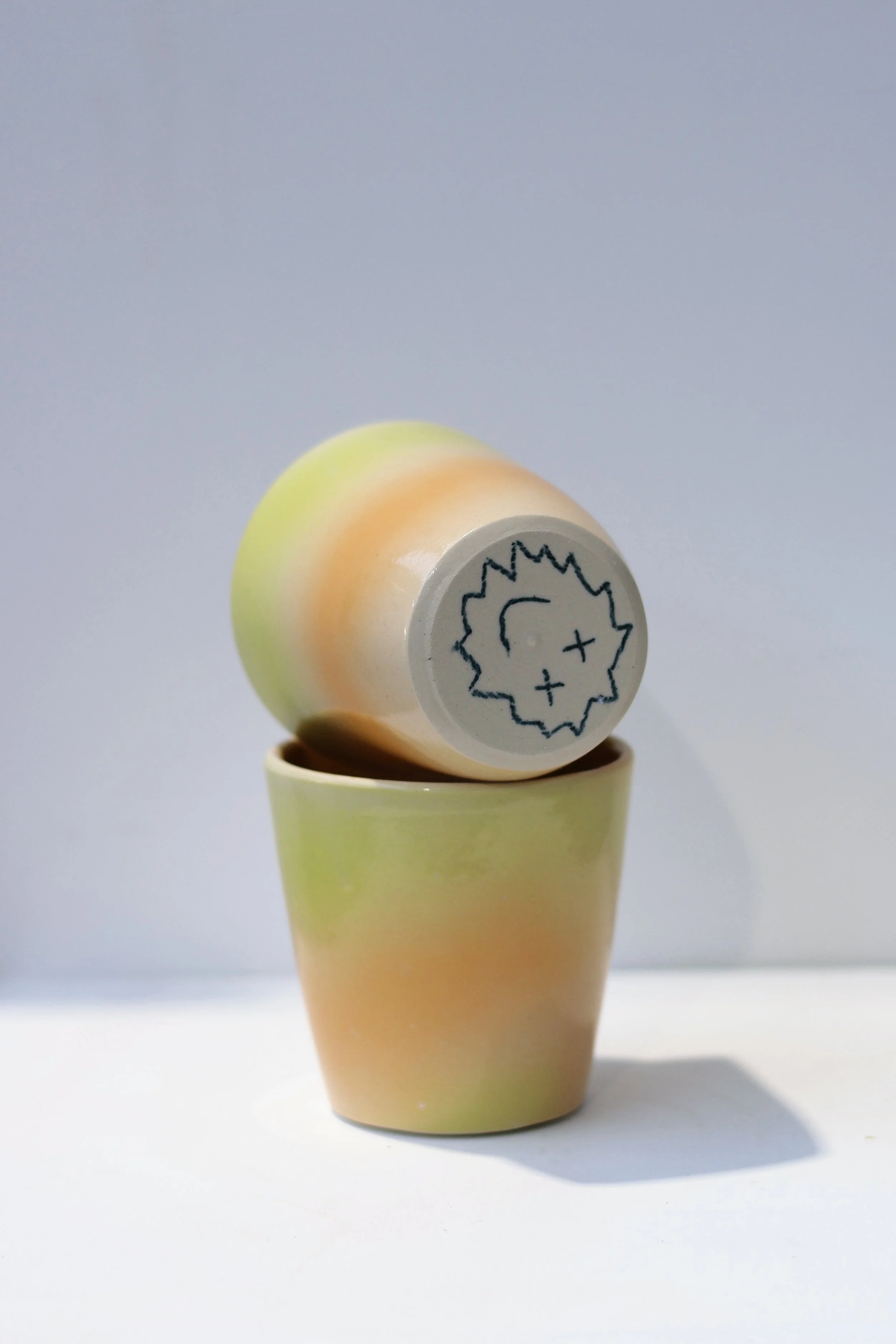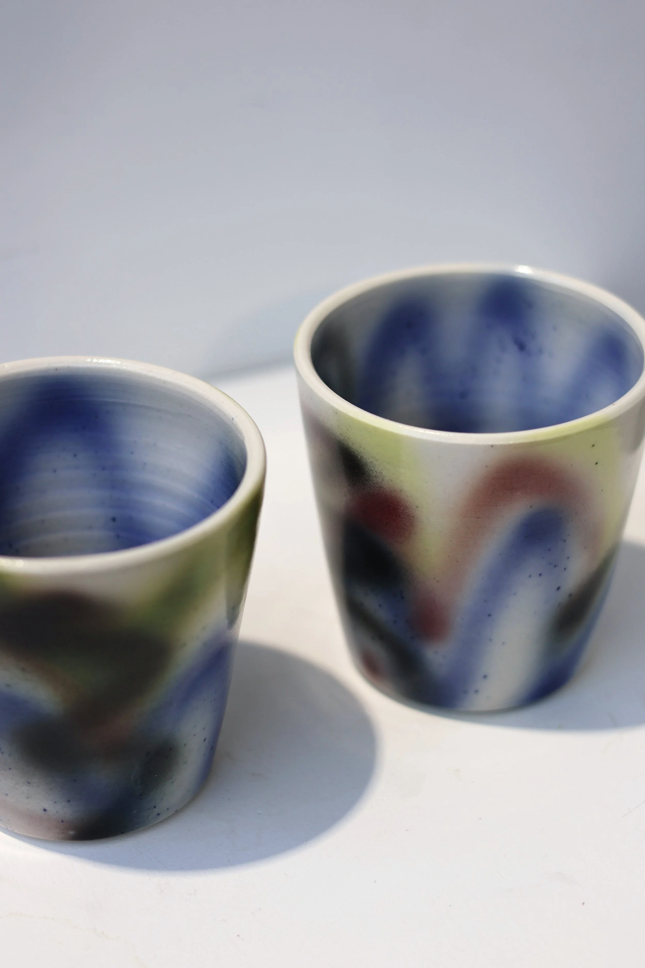 Wheel-thrown porcelain/stoneware cups with hand-decorated surfaces — graffiti-like in gesture, restrained in form.